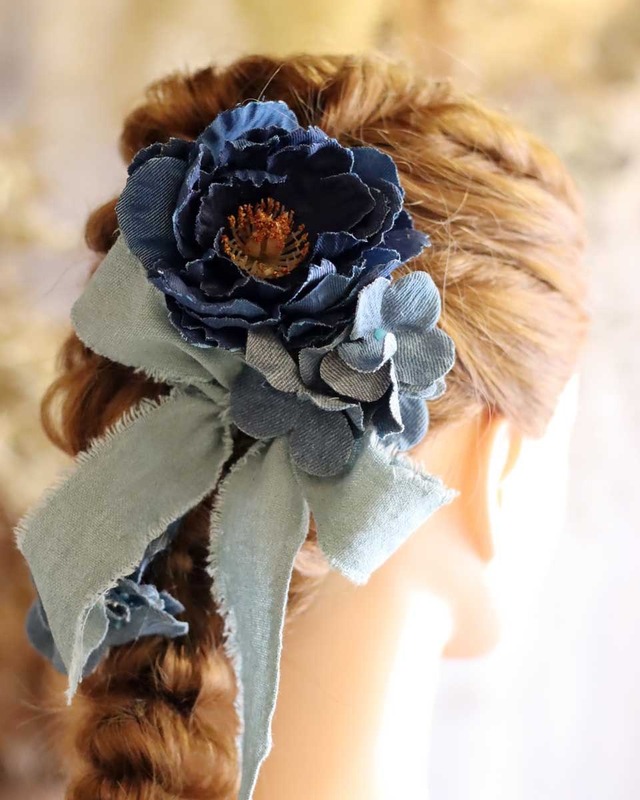 デニム風ののお花(造花)とリボンがセットになった商品です。 1つずつパーツになっていますので、お好きな組み合わせで使っていただけます。 --- 仕様は「ワイヤー仕上げ」と「Uピン仕上げ」をお選びいただけます。 ・ワイヤー仕上げ→たくさん付けられる場合や、美容師さんが付けられる場合はこちらがおすすめです。 ・Uピン仕上げ→推奨しております。 --- リボンは「加工無し」と「リボン結びにUピン仕上げ)」をお選びいただけます。