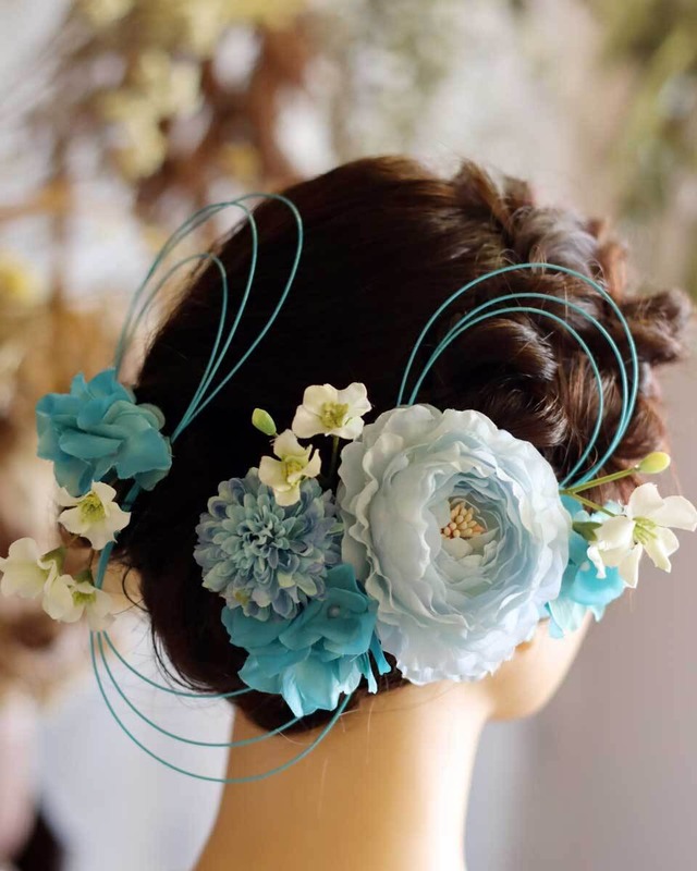 色んな種類のお花(造花)とターコイズの水引がセットになった商品です。 1つずつパーツになっていますので、お好きな組み合わせで使っていただけます。 --- 仕様は「ワイヤー仕上げ」と「Uピン仕上げ」をお選びいただけます。 ・ワイヤー仕上げ→たくさん付けられる場合や、美容師さんが付けられる場合はこちらがおすすめです。 ・Uピン仕上げ→推奨しております。 ---